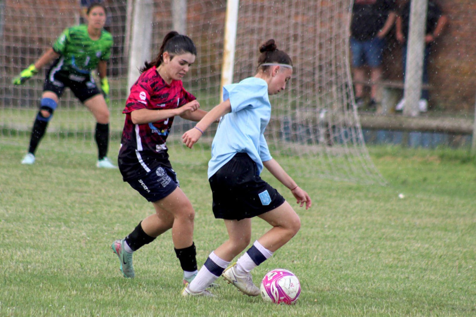 Bahía arrancó mejor, pero sin claridad. Todo lo que llegó al arco local fue fácil para la arquera Lucrecia Hurtado. Cuando Olavarría logró afirmarse en el mediocampo, llegó el 1-0 en una jugada insólita, un pelotazo llovido de Daiana Leonardo, la pelota que se eleva tras un roce, cae mojada, se le escurre de las manos a la arquera Fiorella Carpaneto y termina dentro del arco. Error condicionado por la lluvia y la apertura del marcador.